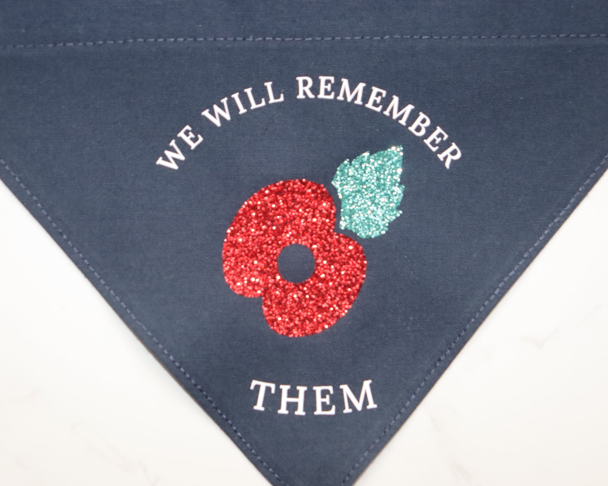 Part of my 2025 Remembrance Bandana collection, We Will Remember is a timeless tribute to those we honour. Featuring a red glitter vinyl poppy design on rich navy blue cotton, this bandana reflects the dignity, courage, and sacrifice of all who served — across generations and borders.