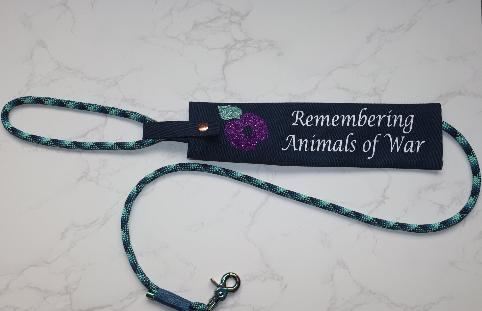 A quiet tribute with everyday purpose. This navy blue waterproof canvas lead sleeve features a shimmering purple glitter poppy and a copper press stud — a subtle, dignified nod to the animals who served alongside humans in times of war.