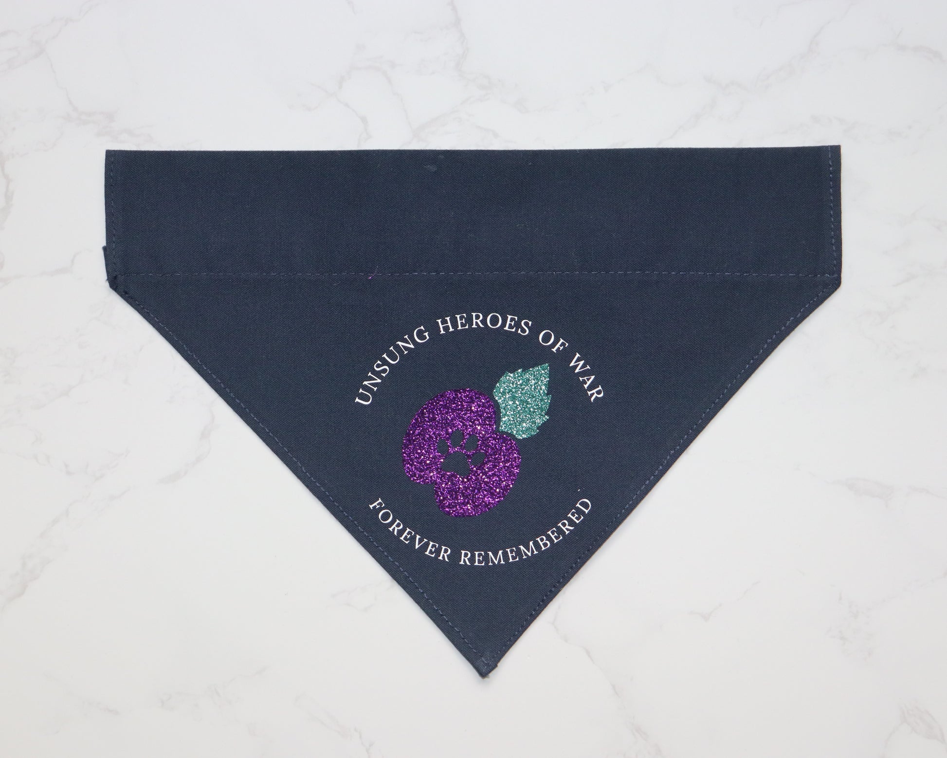 Featuring a purple glitter vinyl poppy design, with a paw print in the middle, on rich navy blue cotton, this bandana is a tribute to those who served without fanfare.
